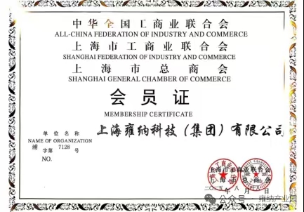 近日,上海雍纳科技(集团)有限公司经严格审查获批入会,正式成为上海市工商业联合会(总商会)会员单位“,同时跻身中华全国工商业联合会会员单位行列。